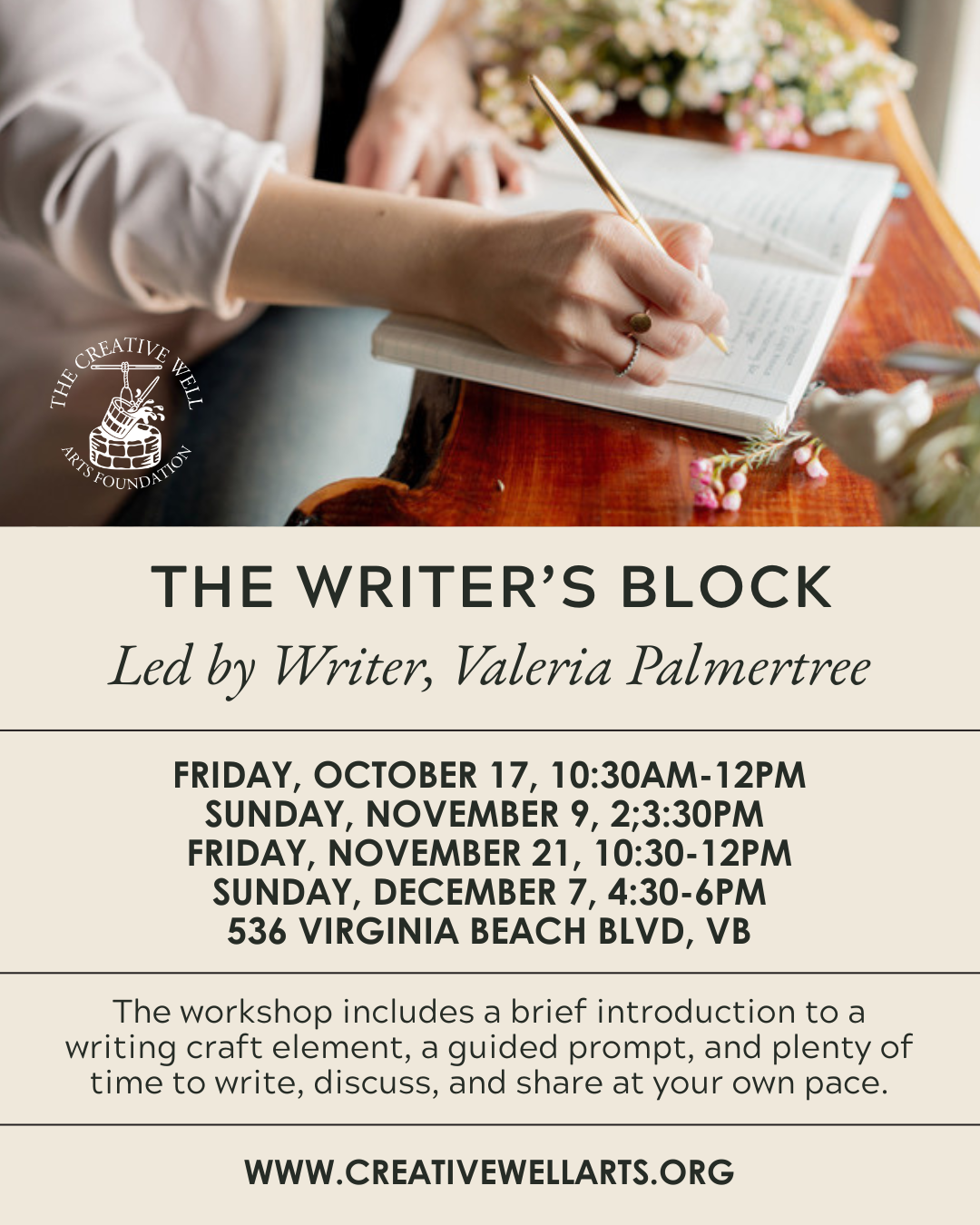 I am delighted to present my first writing workshop, in partnership with The Creative Well Arts Foundation, in Virginia Beach’s ViBe Creative District.